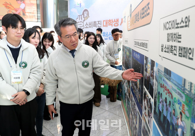 [이데일리 김태형 기자] 박서홍 농협경제지주 농업경제대표이사가 5일 농협중앙회 본관에서 열린 ‘쌀 소비촉진 대학생 서포터즈’해단식에서 서포터즈들과 활동 전시물을 살펴보고 있다.