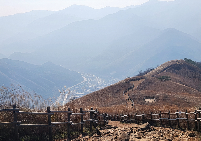 억새의 계절은 가을인데, 왜 초겨울까지… 란 생각은 산을 올려다보곤 사라졌다. 초가을부터 시작된 억새의 금빛 향연이 겨울이라고 갑자기 자취를 감출까. 게다가 남녀노소 삼삼오오 무리 지어 산을 찾는 이들 중 누구 하나 찌푸린 이가 없다. 앞서 간 무리에는 등산용 베이비 백팩에 이제 갓 돌 지난 아기를 업은 엄마도 보인다.
