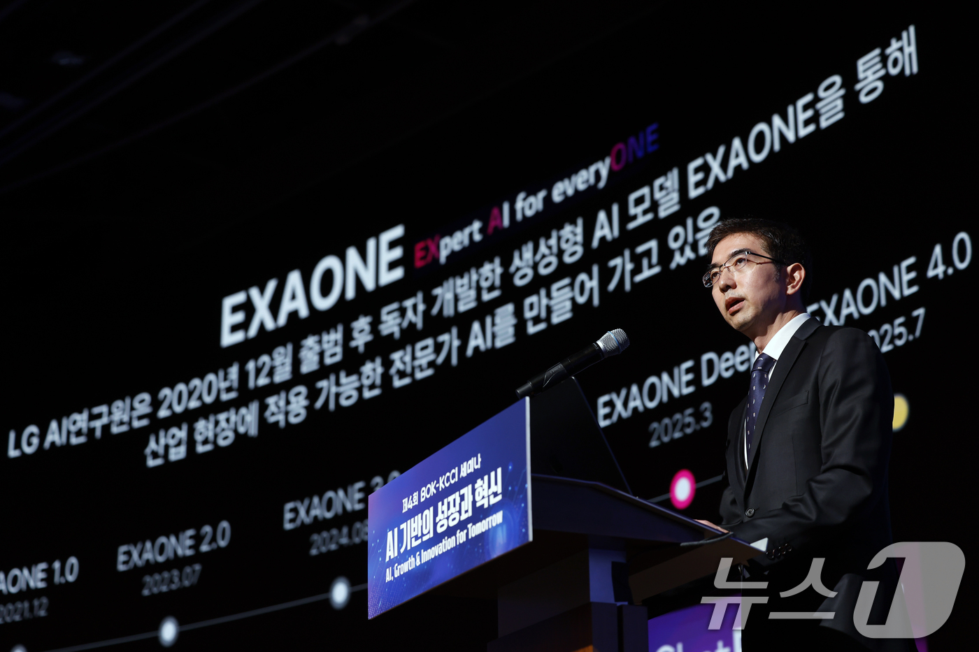 이홍락 LG AI연구원 원장이 5일 오후 서울시 중구 세종대로 대한상공회의소 국제회의장에서 'AI 기반의 성장과 혁신'을 주제로 열린 제4회 한국은행-대한상공회의소(BOK-KCCI) 공동세미나에서 기조강연을 하고 있다. 2025.12.5/뉴스1 ⓒ News1 박정호 기자 |