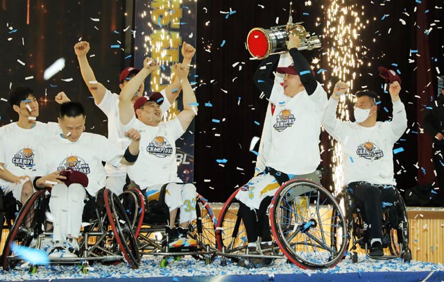 휠체어농구단 코웨이 블루휠스 선수들이 우승컵을 들어올리며 기뻐하고 있다. /코웨이 |