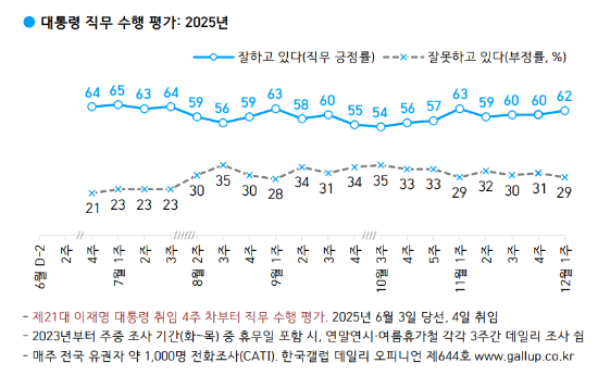 5일 한국갤럽이 지난 2일부터 4일까지 전국 만 18세 이상 1000명을 대상으로 조사한 결과, 이 대통령의 직무 수행에 대해 응답자의 62%가 ‘잘하고 있다’고 평가했다. 이는 최근 2주 연속 60%대였던 수치에 비해 2%포인트 오른 것이다. 반면 ‘잘못하고 있다’는 29%, 의견 유보는 8%로 집계됐다.