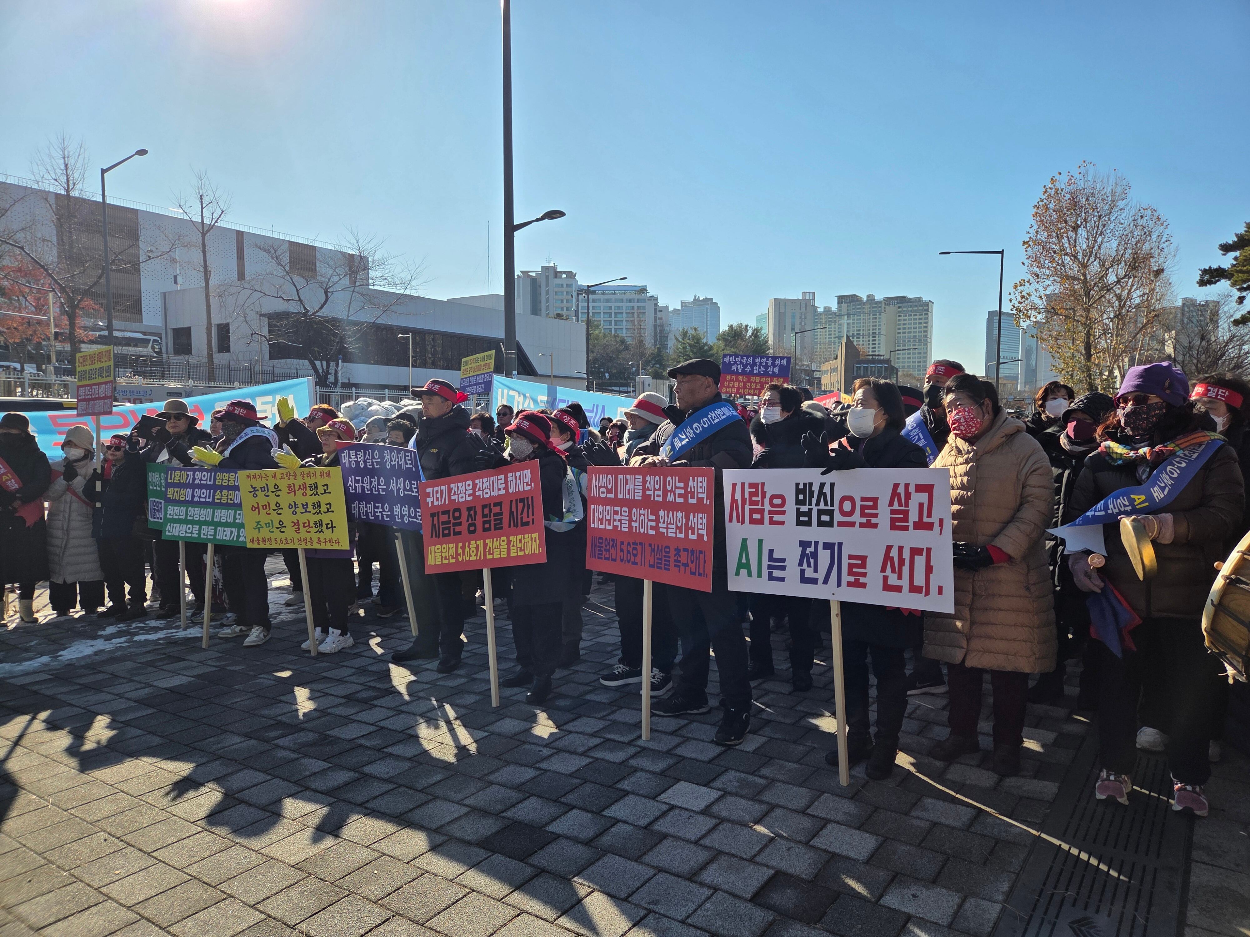 울산 울주군에서 상경한 주민 350여 명은 이날 대통령실 인근에서 신규 원전 건설을 촉구하는 집회를 열었다. 이날 주민 이용진씨는 단상 앞에서 “원전을 수출하자면서 정작 자국에서는 안 짓는다는 게 말이 되느냐”며 “대통령은 (지을) 부지가 없다고 하는데, 우리가 준비돼 있다”고 말하자 참가자들 사이에서는 환호가 나왔다. 집회는 대통령실에 원전 건설 재개를 요청하는 서한을 전달하면서 마무리됐다.