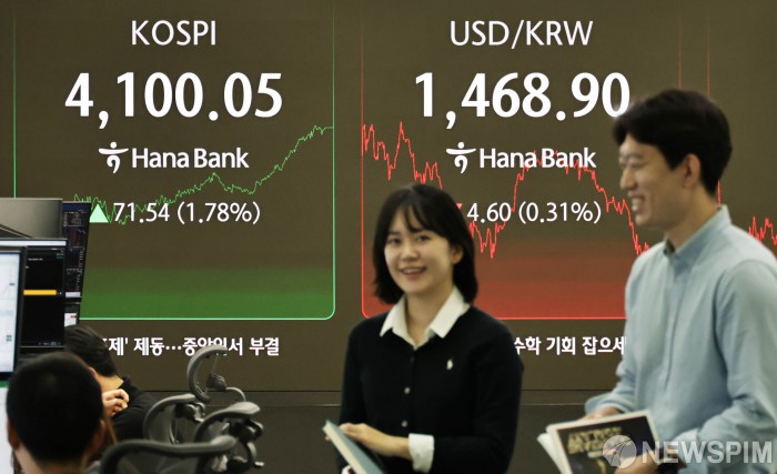 [서울=뉴스핌] 양윤모 기자 = 5일 오후 코스피가 전장 종가보다 71.54 포인트(1.78%) 상승하며 4100.05로, 코스닥은 5.09 포인트(0.55%) 하락한 924.74로 장을 마감한 가운데, 서울 중구 하나은행 딜링룸에서 직원들이 업무를 보고 있다. 서울외환시장에서 달러/원 환율은 전장 대비 4.60원 하락한 1468.90원에 주간거래를 마감했다. 2025.12.05 yym58@newspim.com