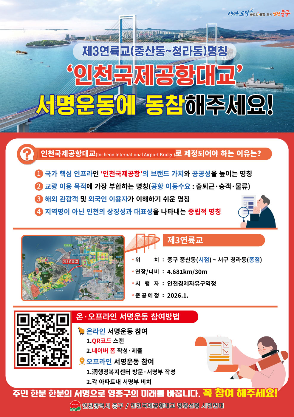 중구는 5일 ‘2025년 제4회 중구 지명위원회’를 열고 제3연륙교의 명칭을 ‘인천국제공항대교’로 최종 결정했다고 밝혔다. 이어 오는 26일까지 국토교통부 국가지명위원회에 재심의를 청구할 예정이다.