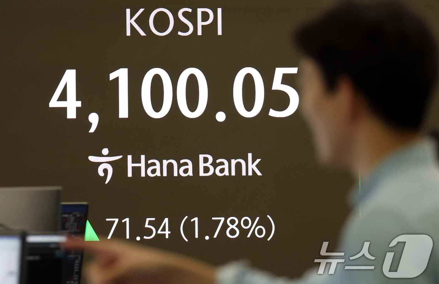 (서울=뉴스1) 김명섭 기자 = 5일 오후 서울 중구 하나은행 딜링룸 전광판에 시황과 원달러 환율이 보이고 있다. 이날 코스피 지수는 전 거래일 대비 71.54포인트(1.78%) 오른 4,100.05로, 코스닥 지수는 전 거래일 대비 5.09포인트(0.55%) 내린 924.74로 장을 마감했다. 2025.12.5/뉴스1