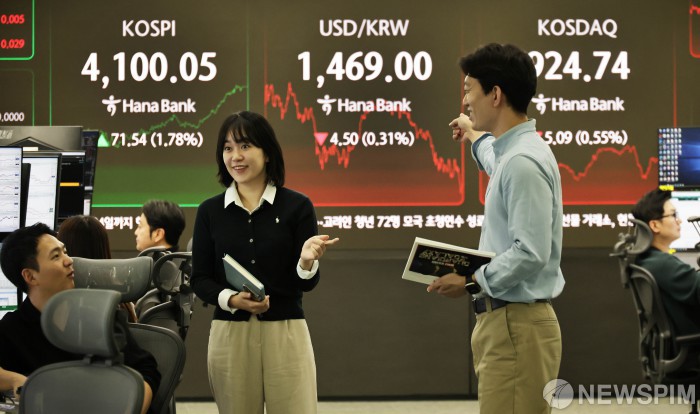 [서울=뉴스핌] 양윤모 기자 = 5일 오후 코스피가 전장 종가보다 71.54 포인트(1.78%) 상승하며 4100.05로, 코스닥은 5.09 포인트(0.55%) 하락한 924.74로 장을 마감한 가운데, 서울 중구 하나은행 딜링룸에서 직원들이 업무를 보고 있다. 서울외환시장에서 달러/원 환율은 전장 대비 4.50원 하락한 1468.00원에 주간거래를 마감했다. 2025.12.05 yym58@newspim.com