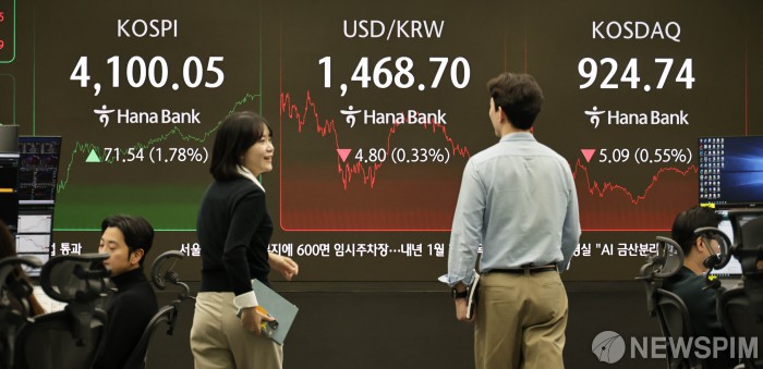 [서울=뉴스핌] 양윤모 기자 = 5일 오후 코스피가 전장 종가보다 71.54 포인트(1.78%) 상승하며 4100.05로, 코스닥은 5.09 포인트(0.55%) 하락한 924.74로 장을 마감한 가운데, 서울 중구 하나은행 딜링룸에서 직원들이 업무를 보고 있다. 서울외환시장에서 달러/원 환율은 전장 대비 4.80원 하락한 1468.70원에 주간거래를 마감했다. 2025.12.05 yym58@newspim.com