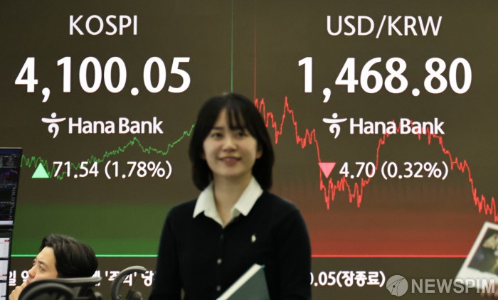 [서울=뉴스핌] 양윤모 기자 = 5일 오후 코스피가 전장 종가보다 71.54 포인트(1.78%) 상승하며 4100.05로, 코스닥은 5.09 포인트(0.55%) 하락한 924.74로 장을 마감한 가운데, 서울 중구 하나은행 딜링룸에서 직원들이 업무를 보고 있다. 서울외환시장에서 달러/원 환율은 전장 대비 4.70원 하락한 1468.80원에 주간거래를 마감했다. 2025.12.05 yym58@newspim.com