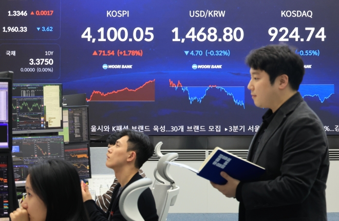 코스피가 4100선을 회복한 5일 서울 중구 우리은행 본점에서 직원들이 증시와 환율을 모니터링하고 있다. 연합뉴스 |