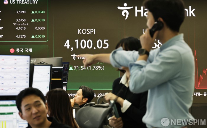 [서울=뉴스핌] 양윤모 기자 = 5일 오후 코스피가 전장 종가보다 71.54 포인트(1.78%) 상승하며 4100.05로, 코스닥은 5.09 포인트(0.55%) 하락한 924.74로 장을 마감한 가운데, 서울 중구 하나은행 딜링룸에서 직원들이 업무를 보고 있다. 서울외환시장에서 달러/원 환율은 전장 대비 4.70원 하락한 1468.80원에 주간거래를 마감했다. 2025.12.05 yym58@newspim.com