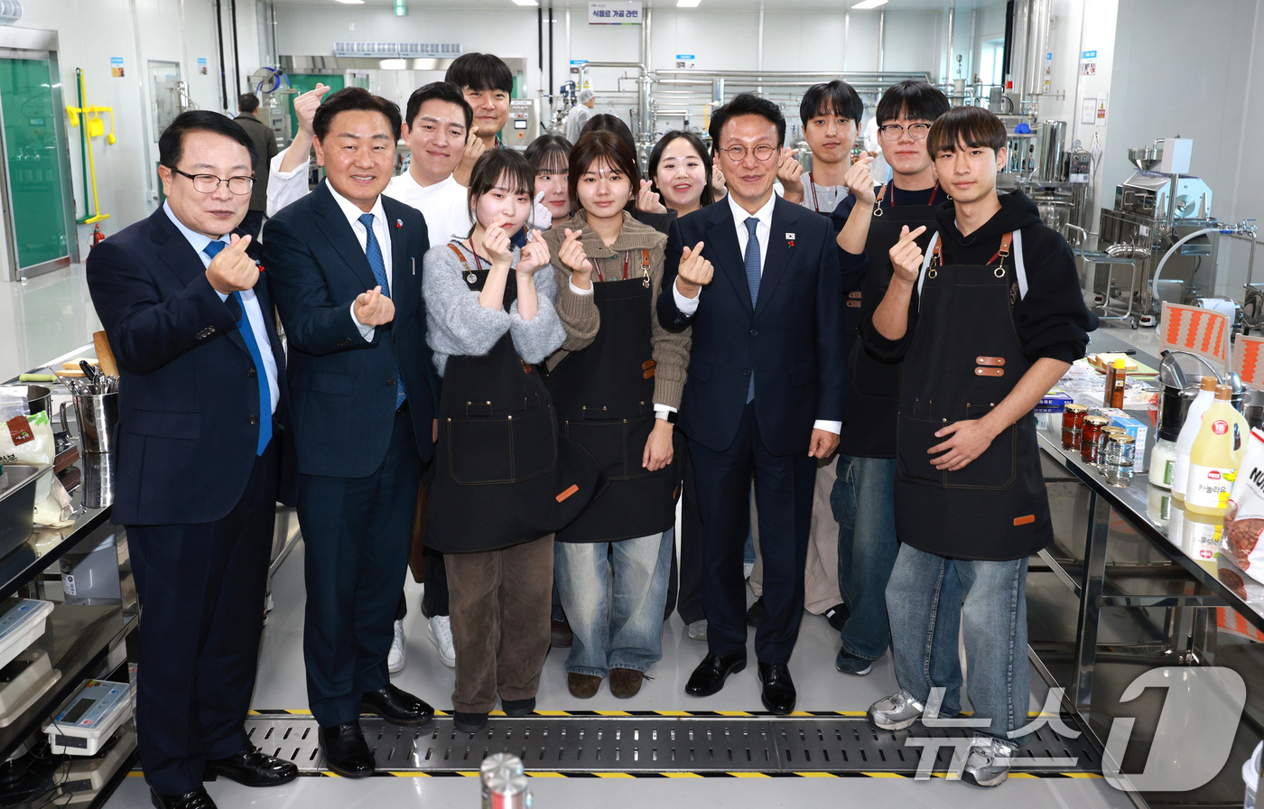 (익산=뉴스1) = 김민석 국무총리가 5일 전북 익산시 한국식품산업클러스터진흥원 청년식품창업센터에 방문해 창업센터 시찰을 마치고 기념촬영을 하고 있다. (전북사진기자단) 2025.12.5/뉴스1