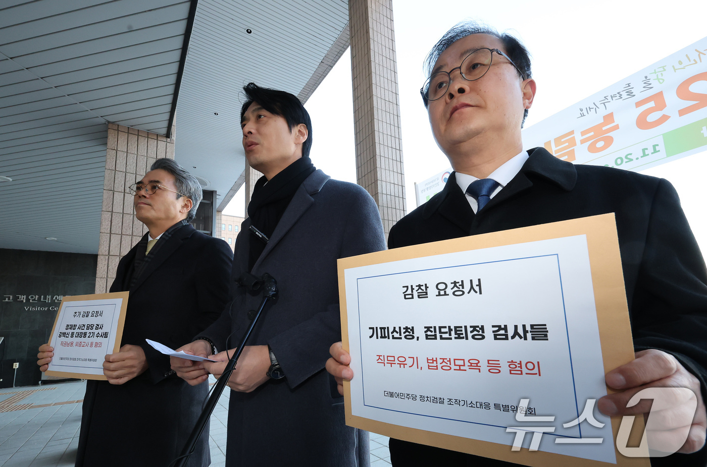 (과천=뉴스1) 장수영 기자 = 더불어민주당 정치검찰 조작기소대응특위 한준호 위원장(가운데)과 이건태 부위원장(오른쪽), 김기표 의원이 5일 오후 경기 정부과천청사 법무부에 감찰 요청서를 제출하기 앞서 기자회견을 하고 있다. 특위는 이화영 전 부지사 위증 재판 집단퇴정 검사 등에 대한 감찰요청서와 정재창 사건 담당 검사 등 대장동 2기 수사팀 직권남용 및 위증교사 혐의 추가 감찰 요청서를 법무부에 제출했다. 2025.12.5/뉴스1