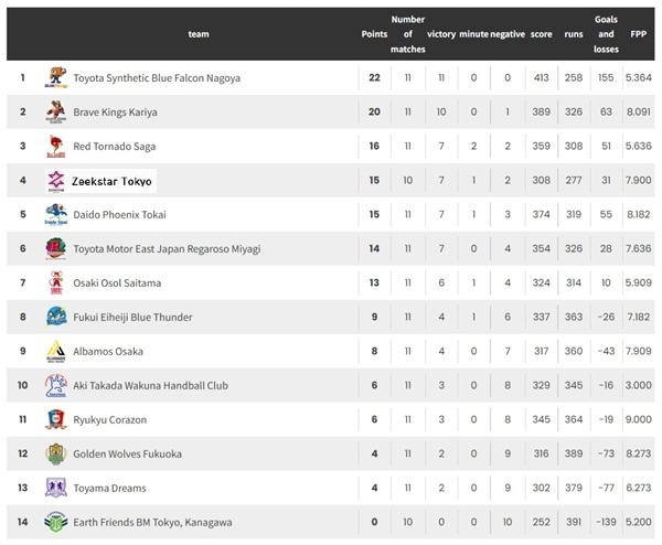 사진 2025-26 시즌 일본 남자 핸드볼 리그 H 11라운드 순위 |