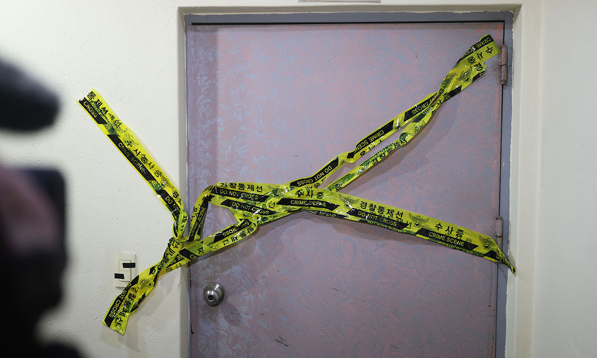 지난 3일 경남 창원시 한 모텔 계단에 경찰 통제선이 설치돼 있다. 연합뉴스 |