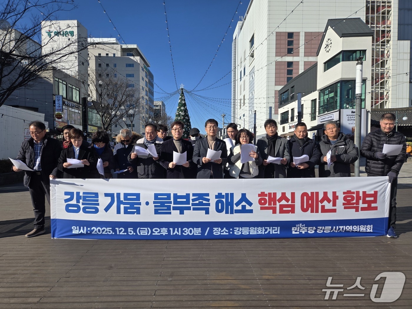 더불어민주당 강릉시지역위원회가 5일 강릉월화거리에서 가뭄 대응 예산 확보 관련 기자회견을 열고 있다.(지역위 제공, 재판매 및 DB 금지) 2025.12.5/뉴스1 |