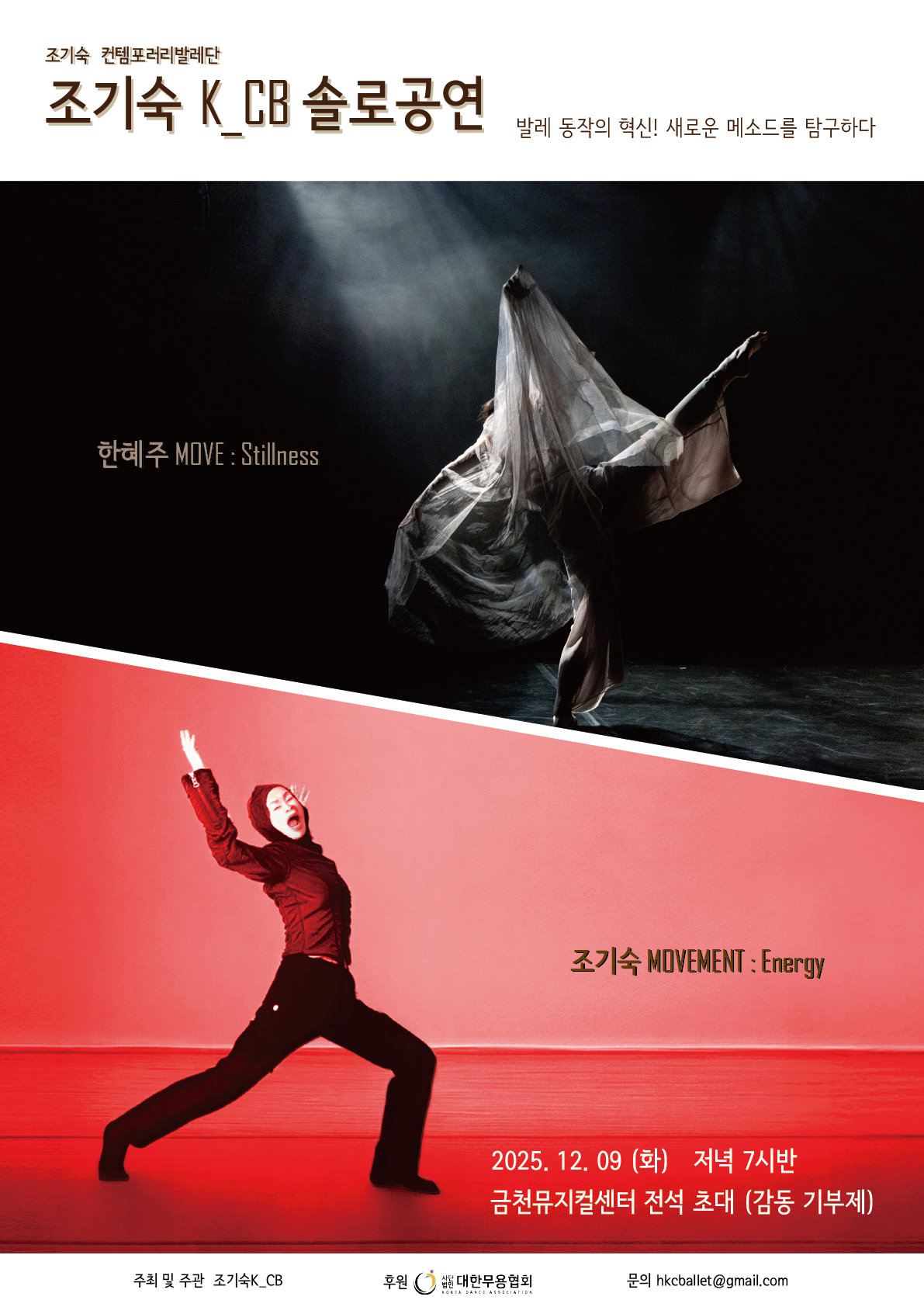 이번 공연에서 조기숙은 자궁과 단전에서 나오는 에너지가 발레 동작을 어떻게 변화시키는지 탐구하는 ‘Movement: Energy’를, 한혜주는 몸이 머무는 ‘사이 공간’에 집중하며 감지되는 몸의 흐름·파동·움직임을 주제로 하는 ‘Move: Stillness’를 무대에 올린다.