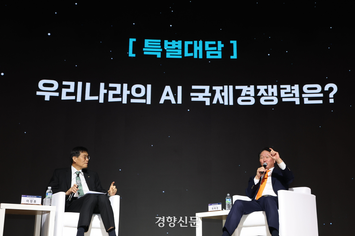 서울 중구 대한상공회의소에서 5일 열린 한국은행, 대한상공회의소 공동주최 ‘AI 기반의 성장과 혁신’ 세미나에서 최태원 대한상공회의소 회장(오른쪽)과 이창용 한국은행 총재가 대담을 나누고 있다. 한수빈 기자 |