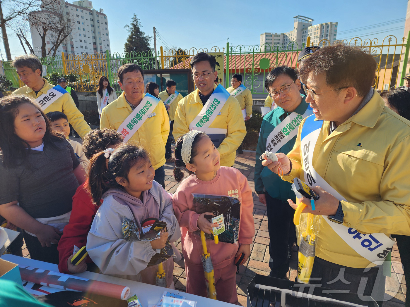 (서울=뉴스1) = 김용균 행정안전부 안전예방정책실장이 5일 전남 나주시 영산포초등학교에서 등하굣길 안전 캠페인을 진행하고 학생들에게 어린이 약취·유인 예방 리플릿과 안전물품을 전달하고 있다. (행정안전부 제공. 재판매 및 DB 금지) 2025.12.5/뉴스1