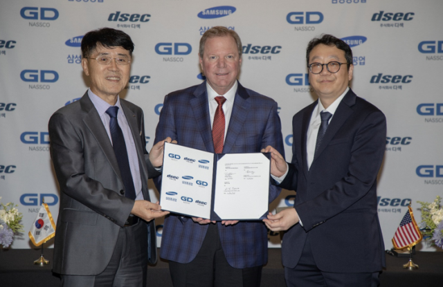 ▲(사진 왼쪽부터) 디섹 윤석용 대표이사, 제너럴 다이내믹스 나스코 데이브 카버(Dave Carver) 사장, 삼성중공업 미주사업팀 강주년 팀장이 MOA 체결 후 기념사진을 촬영하고 있다.ⓒ디섹(DSEC) 제공 |