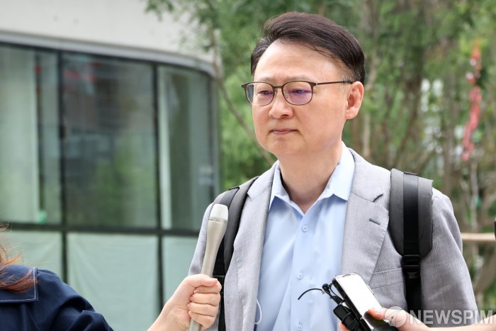 김건희 여사 관련 의혹을 수사하는 민중기 특별검사팀이 5일 웰바이오텍 주가조작 혐의로 구속된 구세현 전 웰바이오텍 대표를 구치소에서 강제 구인해 조사하고 있다. 사진은 구 전 대표가 지난 7월 13일 오전 서울 종로구 민중기 특검 사무실에 출석하며 취재진의 질문을 받고 있는 모습. [사진=뉴스핌 DB] |