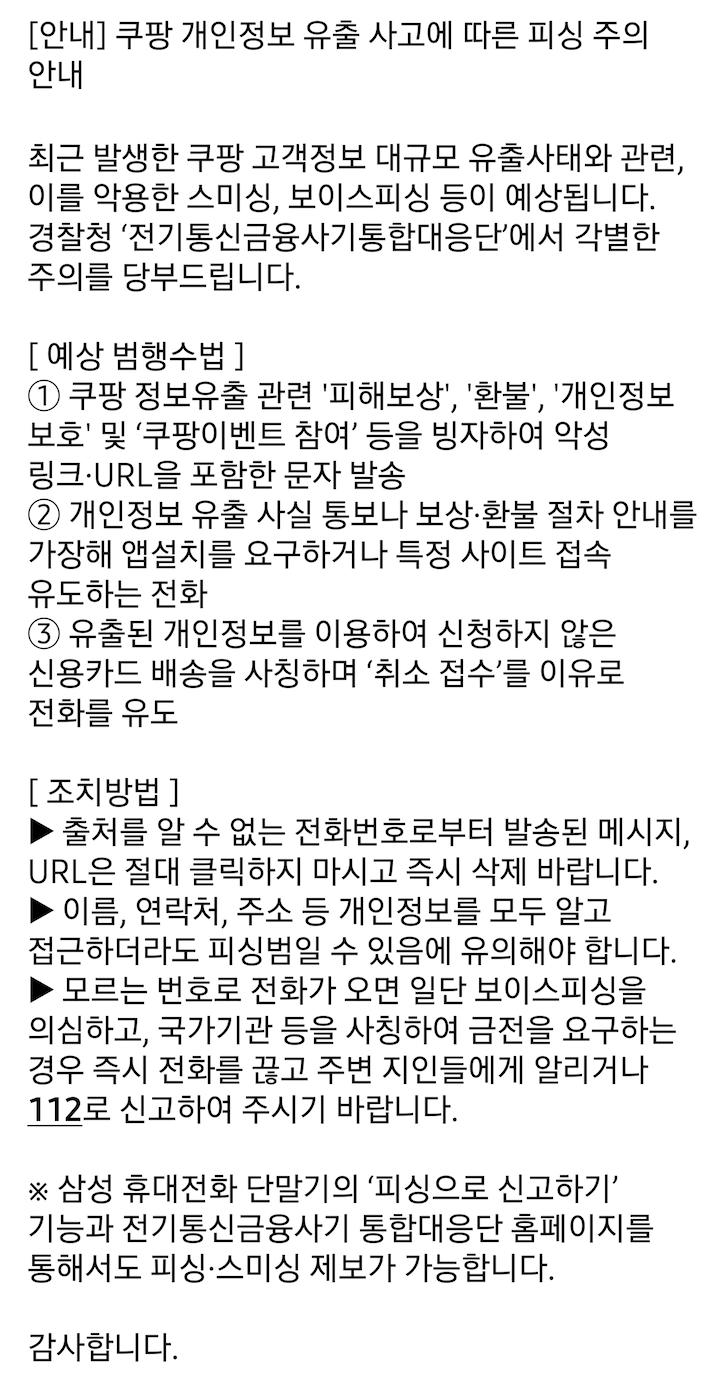 경찰청 전기통신금융사기통합대응단이 쿠팡 고객정보 유출 사고를 악용한 '피해보상', '쿠팡이벤트 참여' 등 명목의 악성 링크 시도에 주의를 요청하는 안내 문자를 통신사를 통해 발송했다.
