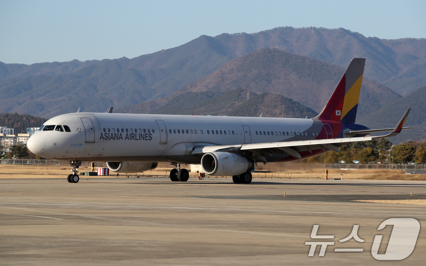 (대구=뉴스1) 공정식 기자 = 대구 도심 군 공항(K-2)과 민간공항을 이전해 대구 군위·경북 의성에 신공항을 건설하는 TK 민·군 통합공항 관련 사업비가 내년 예산에 한 푼도 반영되지 않아 2030년 개항이 사실상 어렵게 됐다. 사진은 대구공항에서 이동하는 아시아나항공 여객기. 2025.12.5/뉴스1
