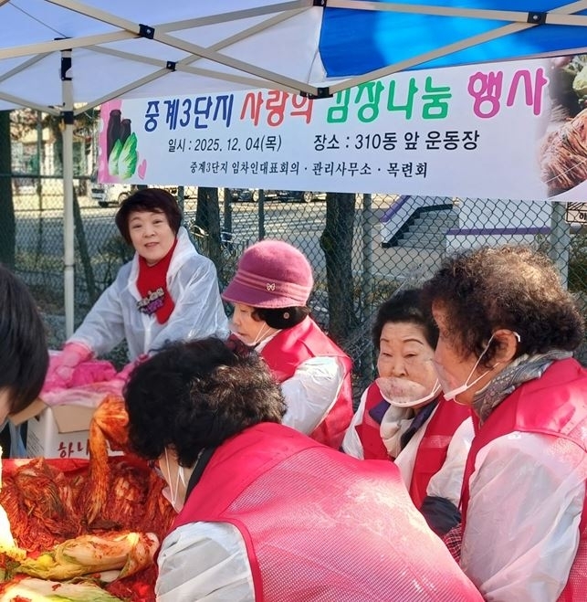 이번 행사는 중계3단지 임차인대표회(회장 박지소)와 관리사무소, 목련회가 함께 마련한 것으로, 낮 기온이 영하 3도까지 떨어지는 혹한 속에서도 서로의 따뜻한 마음을 모아 장애인, 독거 어르신, 취약계층을 위한 겨울 준비에 힘을 보탰다.
