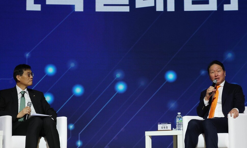 아울러 최 회장은 이 총재가 이른바 ‘인공지능 거품론’에 관해 묻자 “산업 성장 국면에선 주가가 실재보다 더 많이 오르는 오버슈팅 현상이 항상 일어난다”며 “전 세계에 돈이 너무 많이 풀렸고, 이 돈이 갈 데가 없다 보니 투기 심리가 작동해 돈이 빠르게 유입된 것”이라고 답했다.