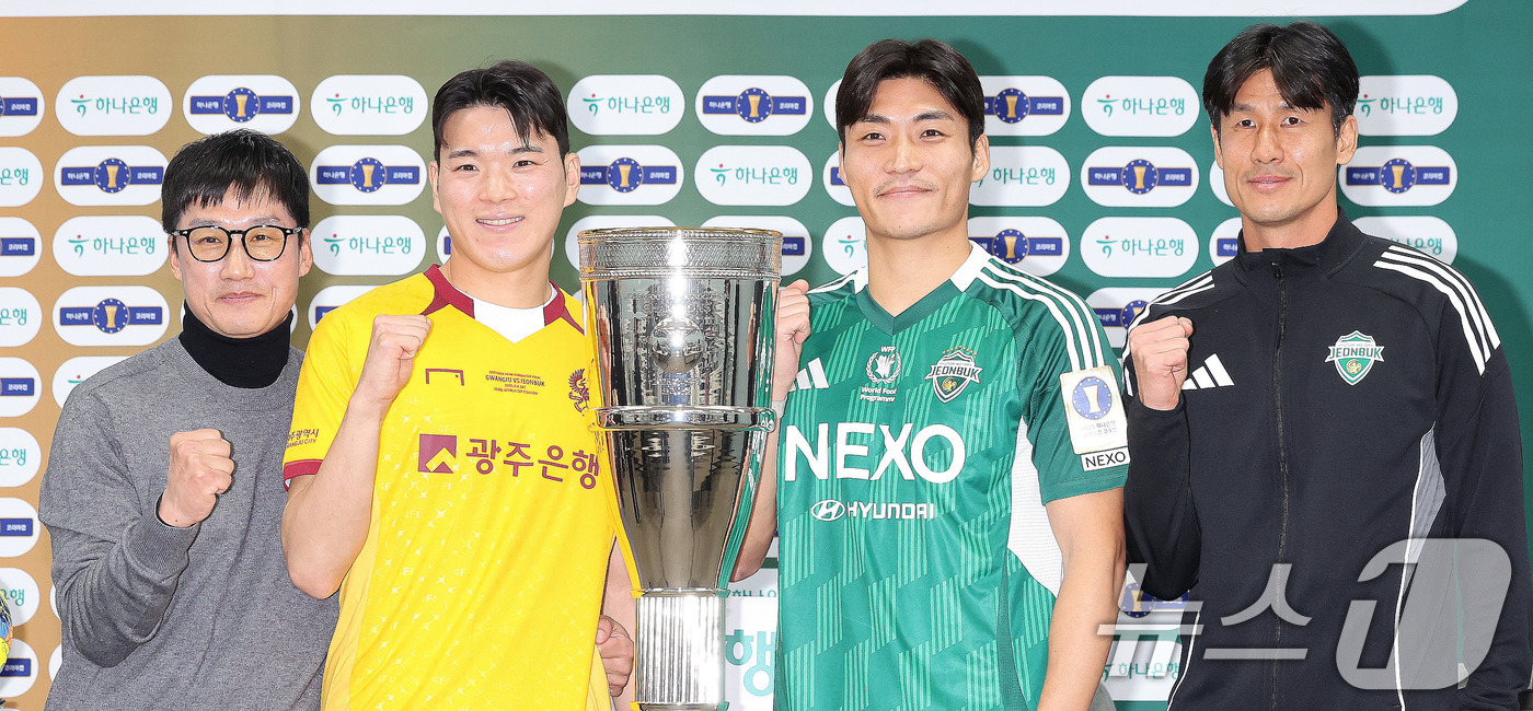 (서울=뉴스1) 박지혜 기자 = 5일 서울 마포구 서울월드컵경기장에서 열린 2025 하나은행 코리아컵 공식 기자회견에서 이정효 광주FC 감독(왼쪽부터), 이강현, 전북현대 박진섭, 정조국 코치가 포즈를 취하고 있다. 전북과 광주는 6일 오후 1시 30분 서울월드컵경기장에서 2025 하나은행 코리아컵 결승전을 벌인다. 2025.12.5/뉴스1