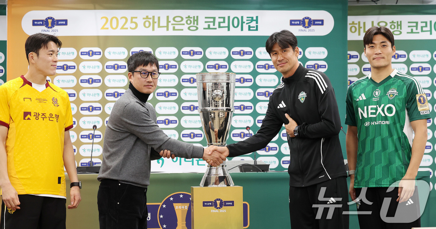 (서울=뉴스1) 박지혜 기자 = 5일 서울 마포구 서울월드컵경기장에서 열린 2025 하나은행 코리아컵 공식 기자회견에서 이정효 광주FC 감독과 정조국 전북현대 코치가 악수를 나누고 있다. 전북과 광주는 6일 오후 1시 30분 서울월드컵경기장에서 2025 하나은행 코리아컵 결승전을 벌인다. 2025.12.5/뉴스1