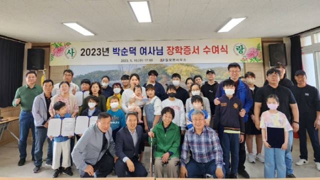 ▲전북 정읍시 칠보면 출신 박순덕(89) 여사가 평생 행상과 폐지·빈 병을 주워 모은 돈 2억4천만원을 고향 학생들을 위해 장학금으로 기부해 지역사회에 깊은 울림을 주고 있다. 사진은 2023년 박순덕 여사의 장학증서 수여식 장면 ⓒ정읍시 |