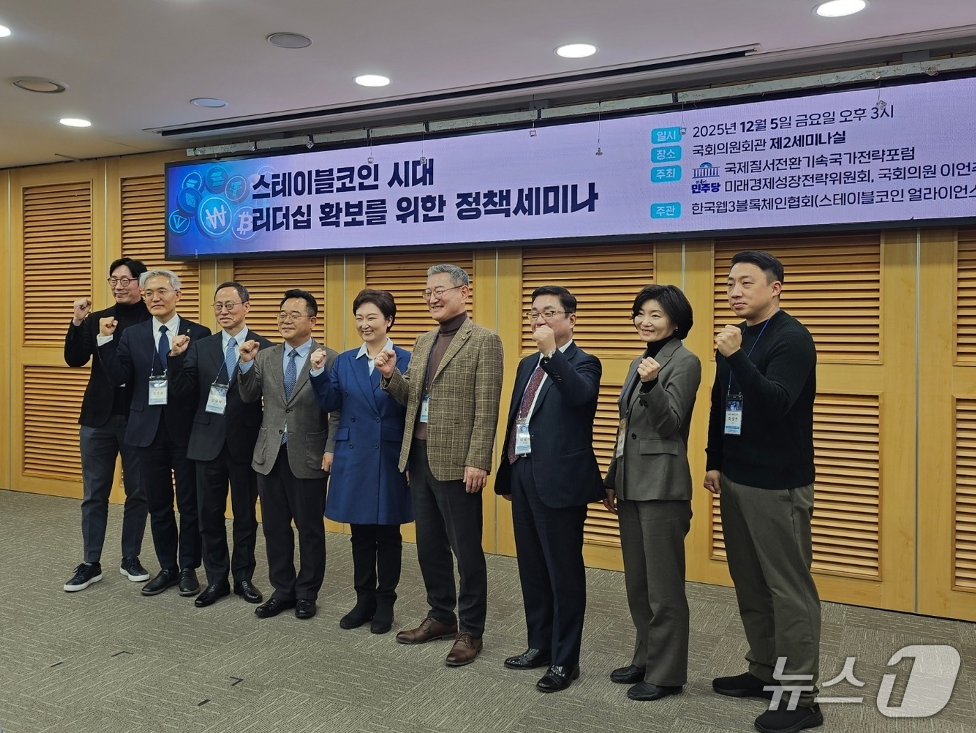 5일 국회 의원회관에서 열린 '스테이블코인 시대 리더십 확보를 위한 정책 세미나'에서 참석자들이 기념촬영을 하고 있다. |