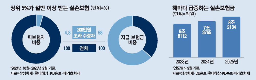 5일 삼성화재·현대해상·KB손해보험·메리츠화재 등 주요 4개 손보사에 따르면 작년 10월부터 올해 9월까지 1년간 실손보험에서 지급된 보험금은 8조8349억원이다. 이 중 연간 200만원 이상 보험금을 타는 가입자 94만명이 1년간 받은 보험금은 총 5조1219억원에 달했다. 전체 가입자 1948만명 중 4.87%에 해당하는 고객이 전체 보험금의 58%를 받아가는 셈이다.