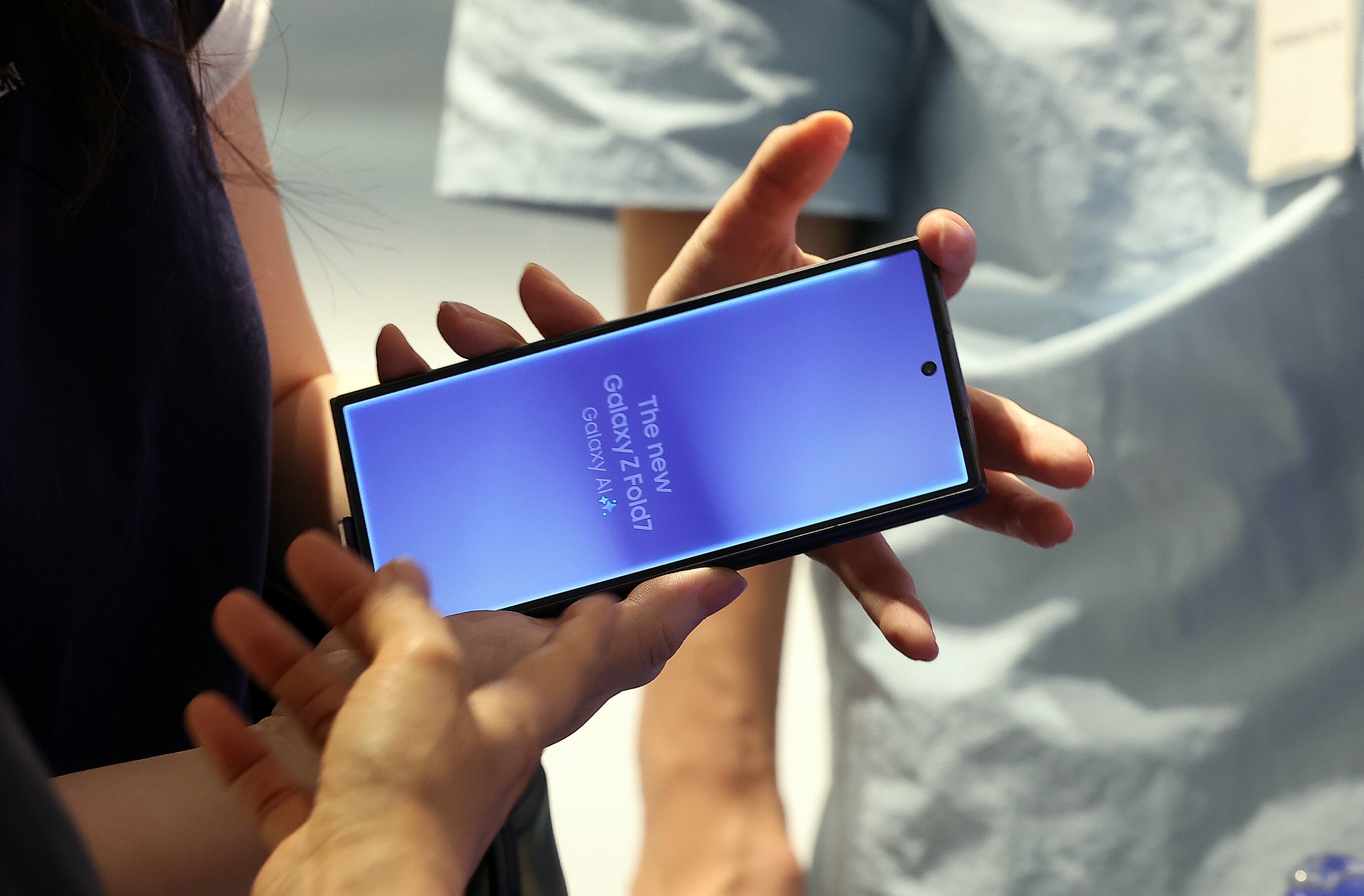 한 손님이 진열된 갤럭시Z폴드7을 살펴보고 있다. /뉴스1 |