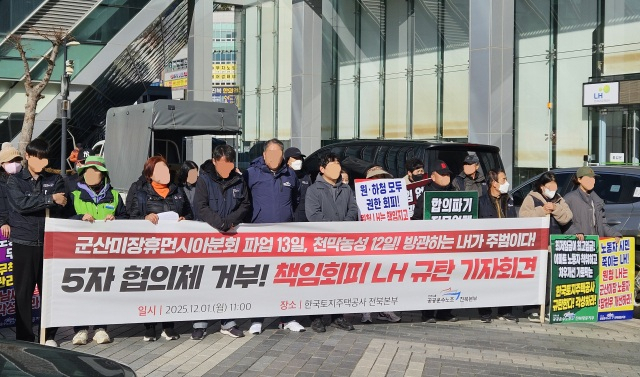 ▲공공운수노조 전북본부가 지난 1일 오전 한국토지주택공사(LH) 전북본부 앞에서 기자회견을 열고 있다. |