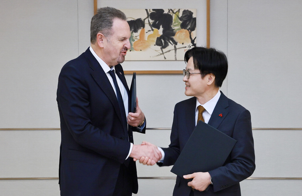김정관 산업통상부 장관(오른쪽)이 5일 서울 용산 대통령실에서 열린 한국 반도체·AI 산업 강화를 위한 양해각서 서명식에서 러네이 하스 Arm 대표와 악수하고 있다. 산업통상부 |