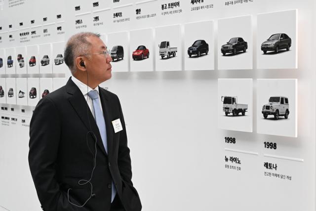 정의선 현대자동차그룹 회장이 5일 경기 용인시 기아 비전스퀘어에서 기아 80주년 기념 전시 '움직임의 유산'을 관람하고 있다. 기아 제공 |