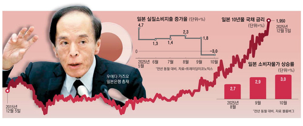 최근 금리 상승의 이유로는 우에다 가즈오 일본은행 총재가 지난 1일 외부 강연에서 기준금리 인상 가능성을 내비친 것이 크다. 우에다 총재는 "미국의 관세 조치를 둘러싼 불확실성은 낮아지고 있으며 기업의 수익도 높은 수준이 유지될 전망"이라며 금리 인상에 부정적인 기존 요인들이 상당 부분 해소됐다는 견해를 비쳤다. 특히 그는 "금리를 높인다고 해도 여전히 완화적인 금융환경"이라며 "경기에 브레이크를 거는 것이 아니다"고 강조하면서 금리 인상을 사실상 공식화했다.
