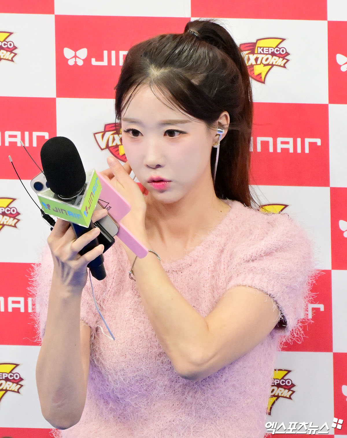 (엑스포츠뉴스 수원, 김한준 기자) 5일 오후 경기도 수원실내체육관에서 열린 '진에어 2025-2026 V-리그' 한국전력과 OK저축은행의 경기, 경기 전 SBS스포츠 진달래 아나운서가 거울을 보고 있다.