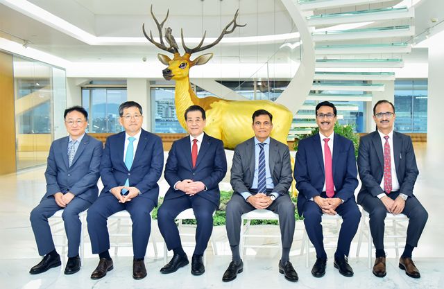 포스코그룹과 JSW그룹 최고 경영진이 지난해 10월 MOU 체결 직후 인도 뭄바이에 소재한 JSW그룹 본사에서 기념 촬영을 하고 있다. /포스코그룹 |