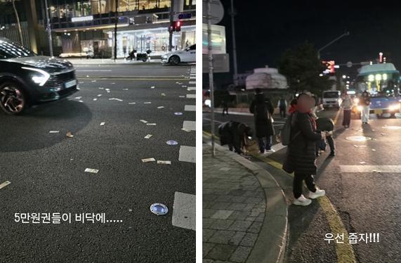인스타그램 이용자 'kiki39n'이 2일 자신의 계정에 올린 사진. 5만 원권 지폐들이 길바닥 곳곳에 떨어져 있는 모습으로, 장소는 서울 중구 을지로4가역 인근이다. 인스타그램 캡처 |