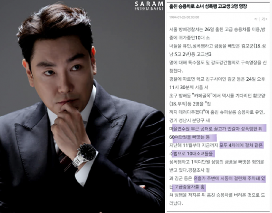 5일 한 온라인 커뮤니티에는 1994년 1월26일 보도된 신문 기사를 언급한 게시글이 올라왔다. '훔친 승용차로 소녀 성폭행 고교생 3명 영장'이라는 제목의 기사로, 당시 서울 방배경찰서가 특수절도 및 강도강간 혐의로 고교생 3명에 대해 구속영장을 신청한 내용이 담겼다.
