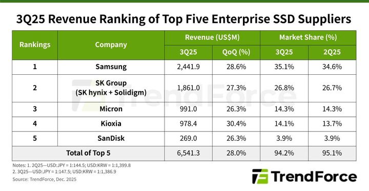 [서울=뉴시스]트렌드포스의 기업용 SSD 매출, 점유율 분석. (사진=트렌드포스 제공) 2025.12.05. photo@newsis.com *재판매 및 DB 금지 |