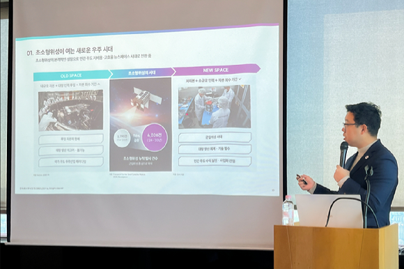 박재필 나라스페이스테크놀로지 대표이사가 2일 서울 여의도에서 열린 기자간담회에서 사업 방향에 대해 설명하고 있다. |