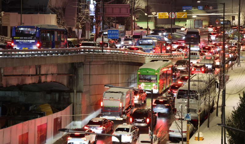 올겨울 첫눈을 맞은 서울 도심이 4일 오후 기습 폭설로 퇴근길 교통 체증에 시달렸다. 서울시는 강설 예보에 맞춰 비상근무 체제를 가동하고 제설제를 사전 살포하는 등 대비에 나섰지만, 도로가 얼어붙는 속도를 따라잡기엔 역부족이었다. 일부 간선도로가 차량 접촉 사고 등으로 지·정체된 점도 교통 흐름이 막힌 원인으로 꼽혔다.