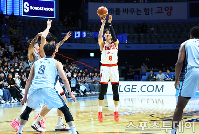 [스포츠투데이 팽현준 기자] 5일 경기도 고양소노아레나에서 열린 2025-2026 프로농구 고양 소노와 서울 SK의 경기, SK 안영준이 슛을 하고 있다. 2025.12.05.