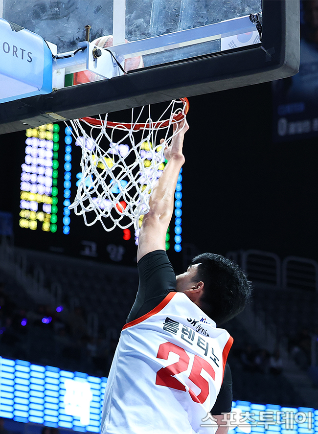 [스포츠투데이 팽현준 기자] 5일 경기도 고양소노아레나에서 열린 2025-2026 프로농구 고양 소노와 서울 SK의 경기, SK 톨렌티노가 슛을 하고 있다. 2025.12.05.