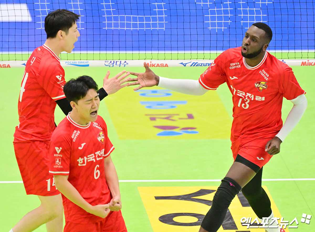 (엑스포츠뉴스 수원, 김한준 기자) 5일 오후 경기도 수원실내체육관에서 열린 '진에어 2025-2026 V-리그' 한국전력과 OK저축은행의 경기, 한국전력 베논이 득점 후 기뻐하고 있다.