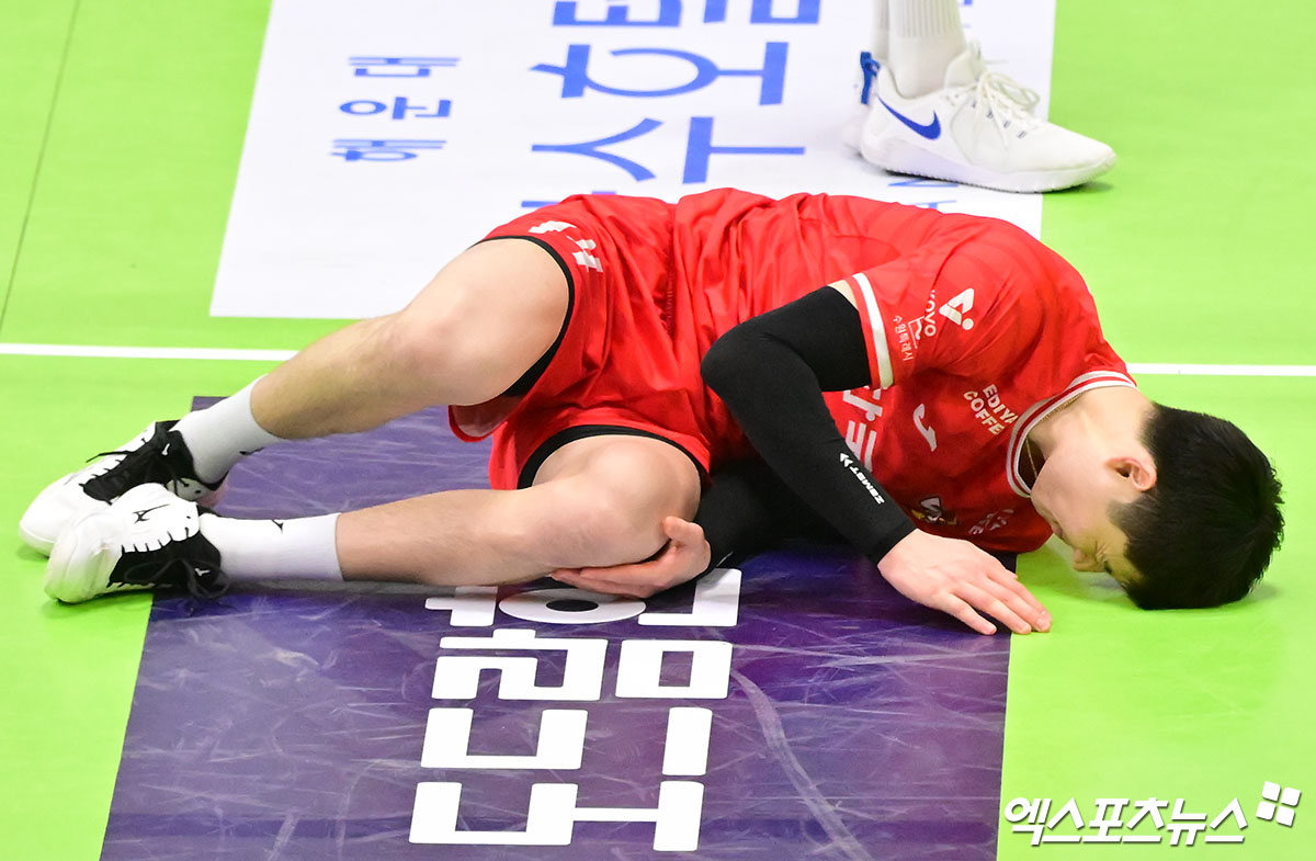 (엑스포츠뉴스 수원, 김한준 기자) 5일 오후 경기도 수원실내체육관에서 열린 '진에어 2025-2026 V-리그' 한국전력과 OK저축은행의 경기, 한국전력 에디가 고통을 호소하고 있다.