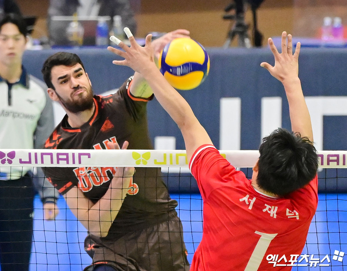(엑스포츠뉴스 수원, 김한준 기자) 5일 오후 경기도 수원실내체육관에서 열린 '진에어 2025-2026 V-리그' 한국전력과 OK저축은행의 경기, OK저축은행 디미트로프가 공격을 시도하고 있다.